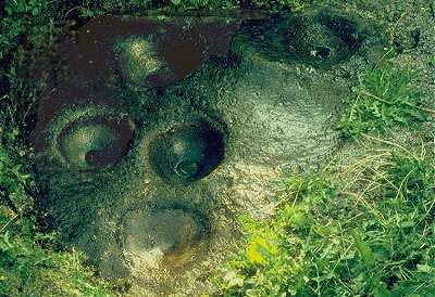 Multiple-bullaun, Killinagh, county Cavan The water-smoothed pebbles can occur on their own as cure-stones (or curse-stones), as on the island of Inishmurray