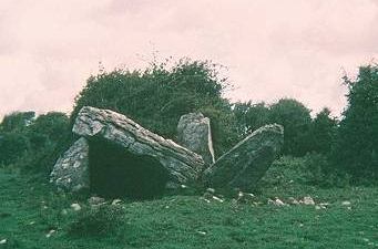 is probably best viewed from afar. It is sited on a stretch of Burren-type limestone, at the NNE end of a cairn some 22 metres long. Two tall portal-stones and a backstone precariously support a tilted capstone 3.5 metres long.