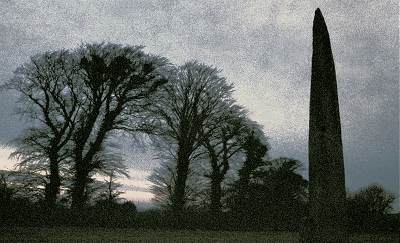 4.5 km SSW of the monolith at Forenaghts Great , to the north of Punchestown racecourse, in a field to the E of a by-road, clearly visible through gaps in the hedge, is a fine tapering monolith which fell in 1931. It was found to be nearly 7 metres long and to weigh 9 tonnes. There was an empty stone kist beside the stone-lined socket, into which "The Long Stone" has now been replaced to stand almost 6 metres high. ~ 800 metres SW, near the racecourse in Craddockstown West (N 911 163) is another menhir, 4.3 metres high. ~ 8 km SSE at Broadleas (N 928 075) are "The Piper's Stones", a stone circle of contiguous, low boulders some 30 metres in diameter. |
