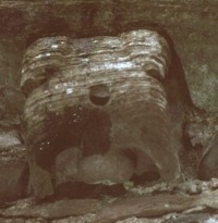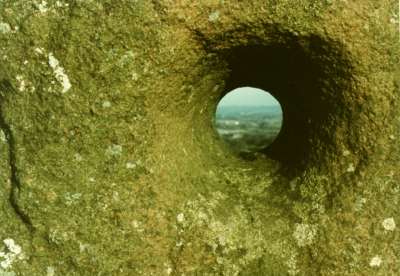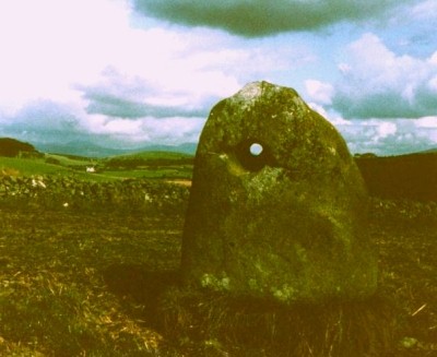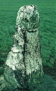 Prehistoric tombs had 'kennel holes' in their door- slabs; and tomb shrines, for example at Bovevagh and Tamlaghtard (Derry), Carrownaff (Donegal), Saul, (Down) and Killabuonia (Kerry) have hand holes for touching the relics of the saint, in a similar kind of sympathetic magic to that of inserting the penis in a perforated slab to attract or ensure fertility. At Aghowle church in Wicklow a very phallic stone about three feet high occurs with a bullaun and a perforated slab on the same site. Some of the holed stones have been used in living memory to cure barrenness in livestock or in people (by passing a garment through the hole) - a function also enjoyed by some of the phallic pillars. One of these, with the Jungian title of 'The White Wife' at Carnalridge in Co. Derry, used to be whitewashed every year - just as the phallic gateposts were, and just as some other phalliform stone in north-east Ireland continue to be painted orange in the month of July. 'The White Wife' is phallic, but from one side looks like a bent old woman - but it is not called 'The White Widow ' or 'The White Hag ' .
