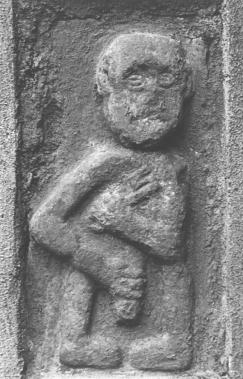 A later mediæval window-top from the sixteenth century Smithstown castle (Clare) is decorated with a curious 'spider web' design and a well-observed penis and scrotum. This recalls similar images of male concupiscence on corbels of churches in Western France. A human figure carved on a gate post at Ballycloghduff (Westmeath) brandishes a key in one hand and a huge penis with the other.