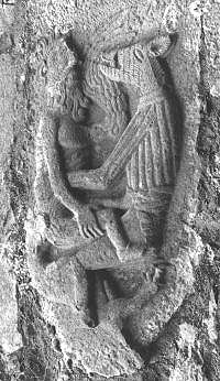 Detail of archivolt, Annaghdown, county Galway a remarkable fifteenth-century carving now built into Kilkea Castle (Kildare) shows a bearded and phallic-helmeted man straddling and being gripped by an ithyphallic man in a boar mask, or a boar-man, while being gnawed from behind by an ithyphallic quadruped and having a bird attack his breast. This may be a unique representation of the Temptation of St Anthony, in which the boar-figure is reminiscent of theriomorphic or masked men on the crosses at Castledermot in the same county.
