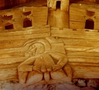 The White Wife, Carnalridge, county Antrim At the other end of the country, at Coolineagh in Cork, an ogham pillar is crowned with a lump of quartzite known as caipín ólann (St Olann's Cap). Originally there were two superimposed stones but because of the phallic character and popularity of the pillar as a cure stone for barrenness, a local priest removed them. They were soon replaced by the present caipín (or a predecessor). Small capstones occur on the Ulster gateposts (see above) and larger, phallic ones (some removed) were tenoned to the tops of the carved crosses of Western Ossory. Sometimes paired pillar stones are quite obviously male and female (the latter with a grooved top). Good examples are at Boherboy (Dublin), Cabragh (Cork) and Sandville (Tyrone). Both phallus and vulva occur together at Boa Island (Fermanagh), where a famous double 'Janiform' torso (two back-to-back figures) is gouged female on one side and has a phallus carved in relief on the other. This site was evidently yet another sanctuary of great importance, and is still a place of powerful atmosphere. It is not until the Romanesque period that whole figures with realistic genitals start to appear in Ireland. These generally represent the sin of Concupiscentia (Lust), and one of the earliest occurs in an Irish-influenced Anglo-Saxon manuscript now in the Vatican. In a 'Canon Table' or list of textual concordances, a rather monkish male figure pulls his beard and indicates his genitals, which are being attacked by snakes, as is his moustache. He is being eternally tortured in Hell for one or all of the sins of Lust (Irregular Motions of the Flesh, etc.) and the snakes attack not only his genitals but his secondary sexual characteristics. Later female figures of Luxuria (the spending of wealth on luxury) have their expensive hairpieces and their breasts similarly attacked, more often than their genitals. There are large numbers of male and female exhibitionists (some depicted as committing their sin, others as suffering for their sin, some also committing other sins such as Drunkenness and Unnatural Acts from contortionism to sodomy) on Romanesque corbels and capitals, especially in France. It is not surprising, therefore, that coital and phallic carvings, masquerading as Sin, should survive among the Romanesque and mediæval ruins of Ireland. On a window of a twelfth-century church at Annaghdown (Galway) a fine ithyphallic dog (symbol of lust and abandon) can be seen.