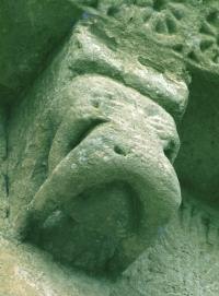 In the same French 'school' is the window-top from Tomregon (Cavan) which shows a bearded, torso-less figure from behind, displaying scrotum but no penis, his long arms being pulled by monsters. This figure has clear affinities with grotesque capitals in the Loire Valley, notably Cunault.